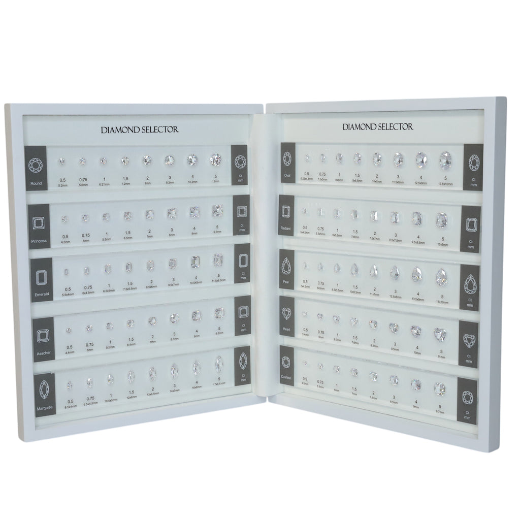 This Diamond Size Comparison Set is the perfect tool to help your clients visualize and select the ideal stone size for their ring. Each shape features 8 high-quality CZs mounted on a clear, see-through plate that makes it easy for clients to see how each stone will look on their finger.