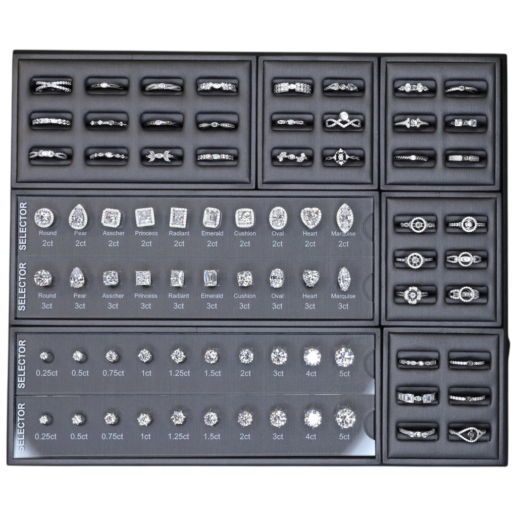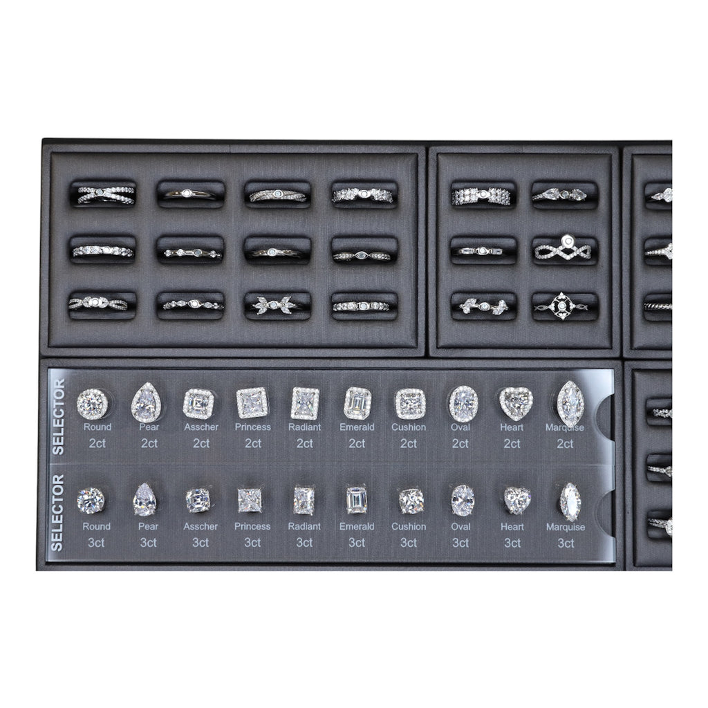 Crafted with a steel grey leatherette material, this elegant display system provides a sophisticated and professional presentation. The interchangeable design enables jewelers to showcase multiple band and center stone combinations in real time, helping customers explore different styles with ease. Whether they prefer a sleek, modern band or a timeless, intricate setting, this system ensures a seamless and interactive shopping experience.