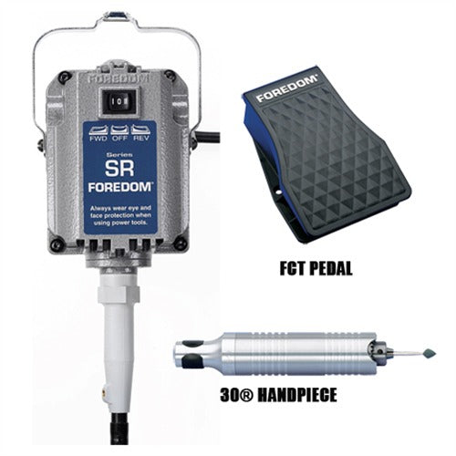 This Foredom kit comes with a SR Motor, a FCT Pedal that gives you high torque at all speeds and a #30 Handpiece.